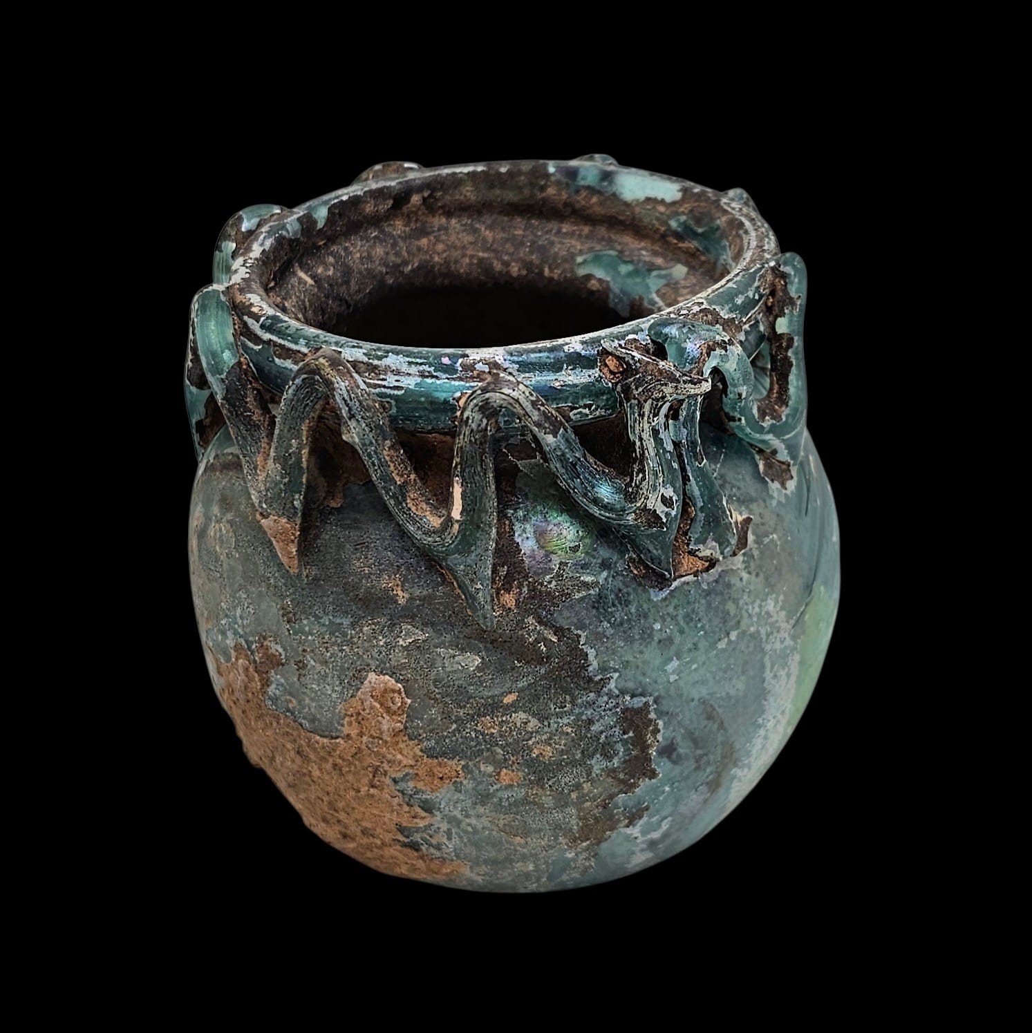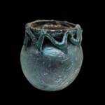 great Blue Patina, Warped tubular rim, folded inward, wide neck, squat globular body, concave base with high conical protrusion toward interior, pontil mark. Between upper part of body and rim, a trail rises and falls ten times in a zigzag around vessel, its ends attached to the wall and the rim. Slightly cloudy.