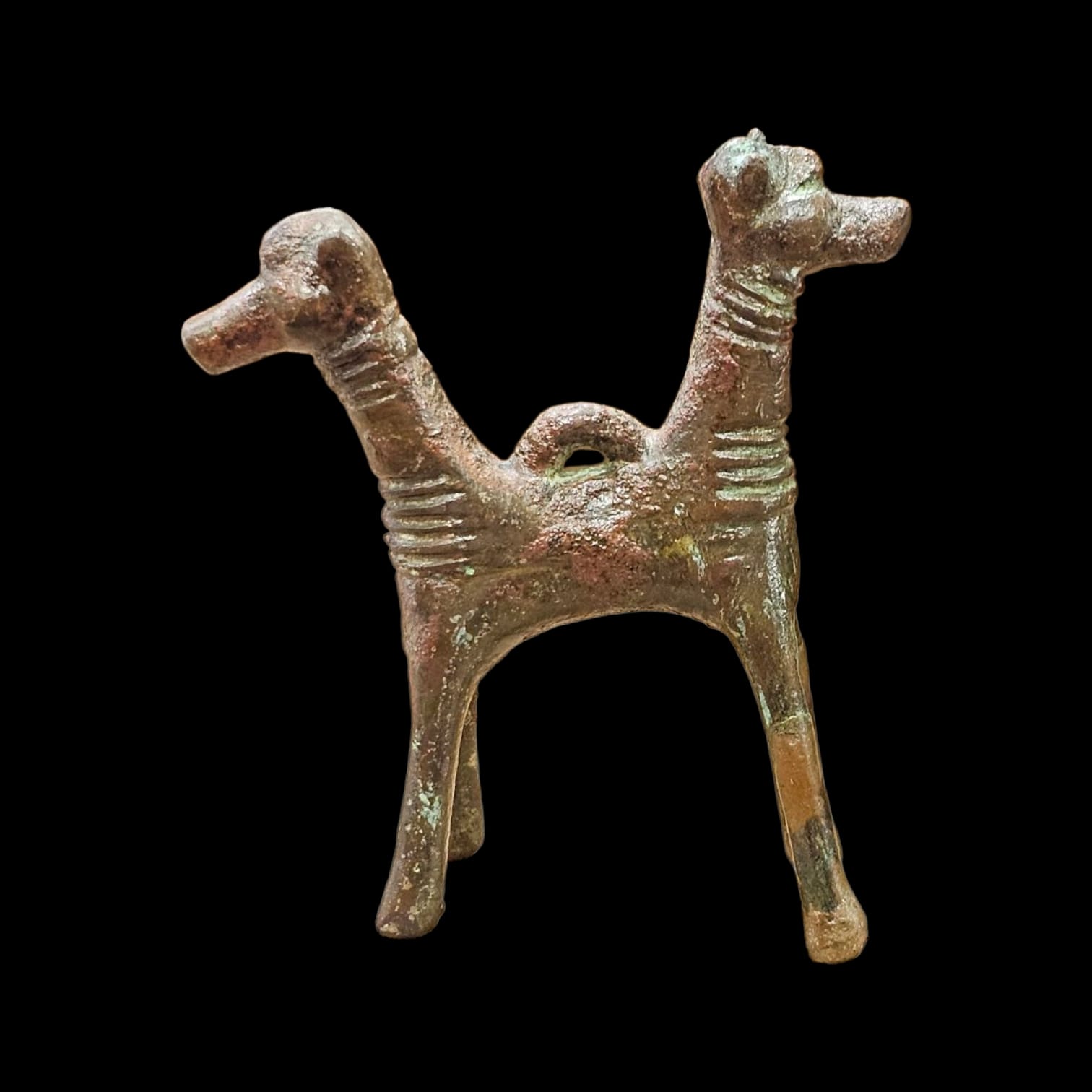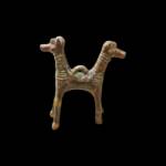 Two addorsed animal heads sharing one body and four legs while fairly large and capable of standing without support, the loops on the back indicate that they served as both pendent and freestanding object.