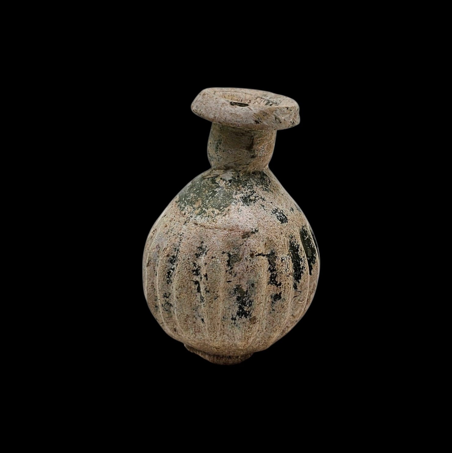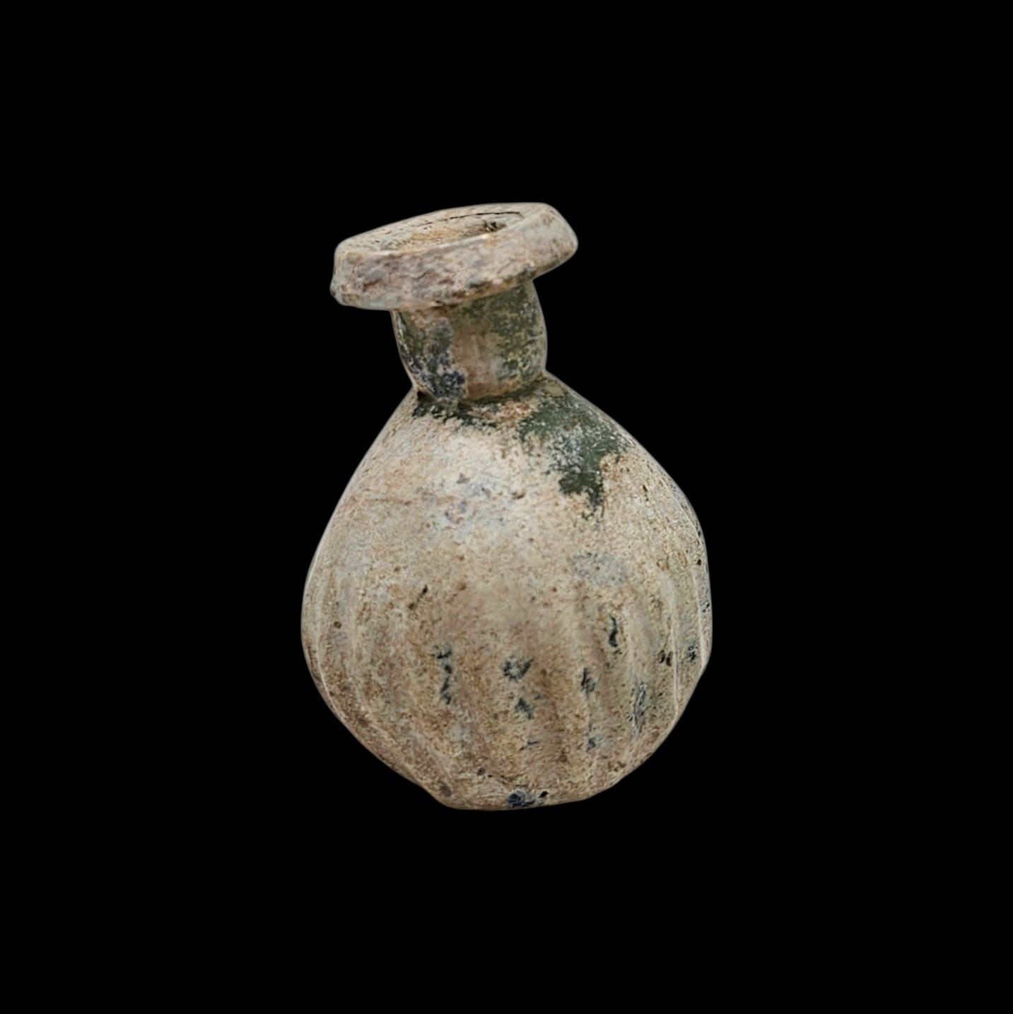 A well-formed Roman sprinkler flask in thick green glass, with a globular body and short cylindrical neck with a slightly everted rim. the body ripped and the surface is richly covered with natural encrustation and early iridescence, giving the piece strong archaeological presence.