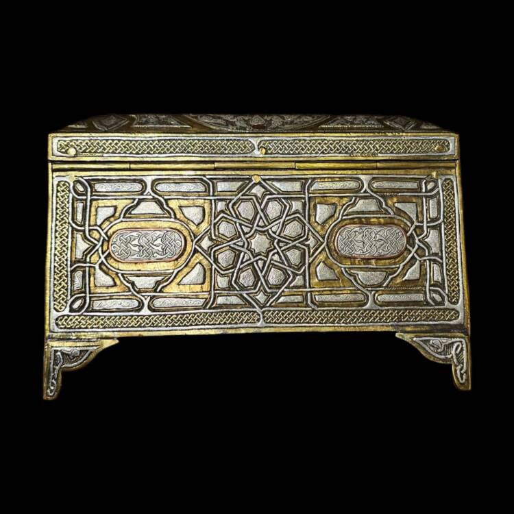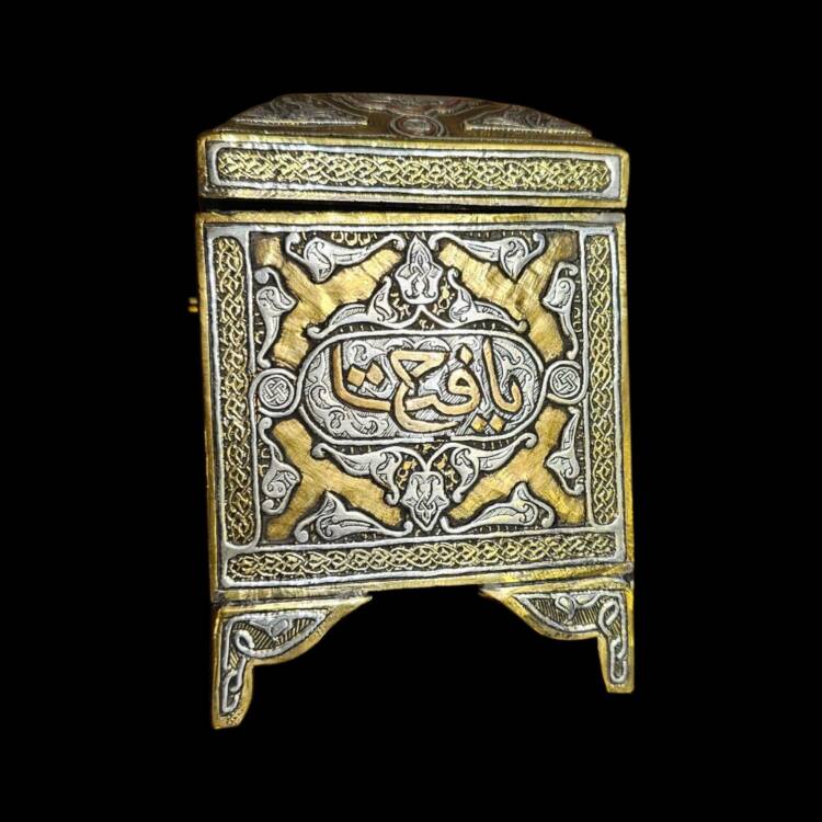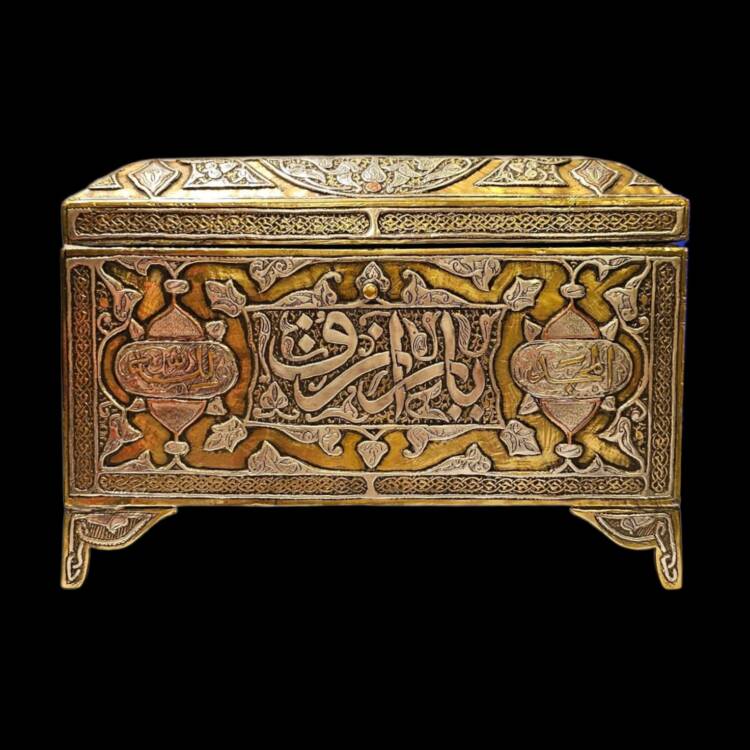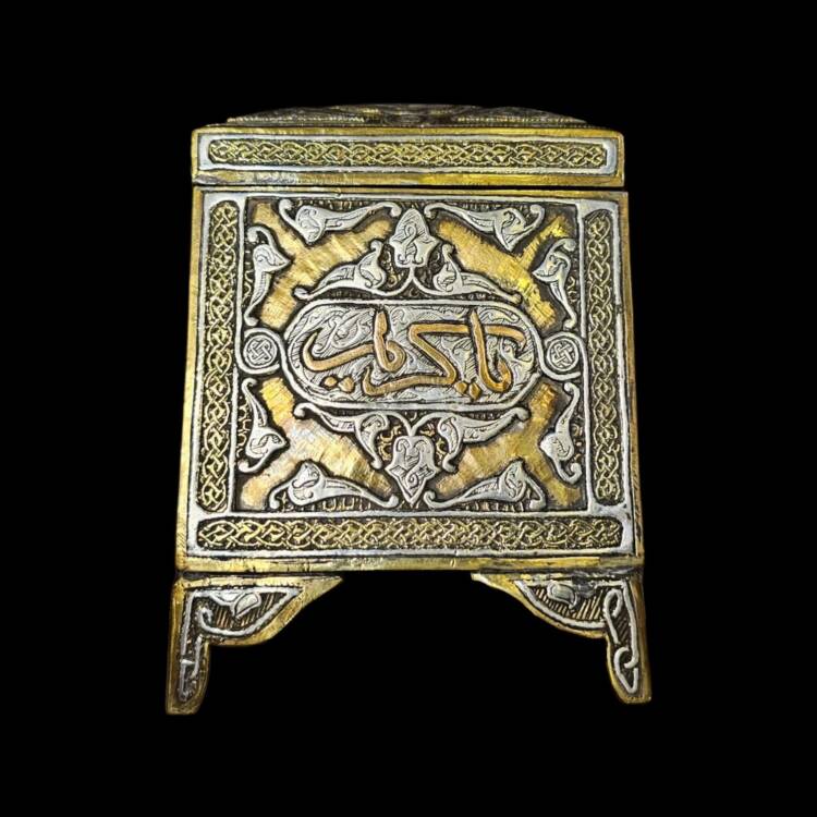 rectangular form on four lobed feet, deep engraved and very fine Details, profusely inlaid in Gold, silver and copper, the sides with bands of Arabic inscription inscription in thuluth, the top of the lid with a rosette