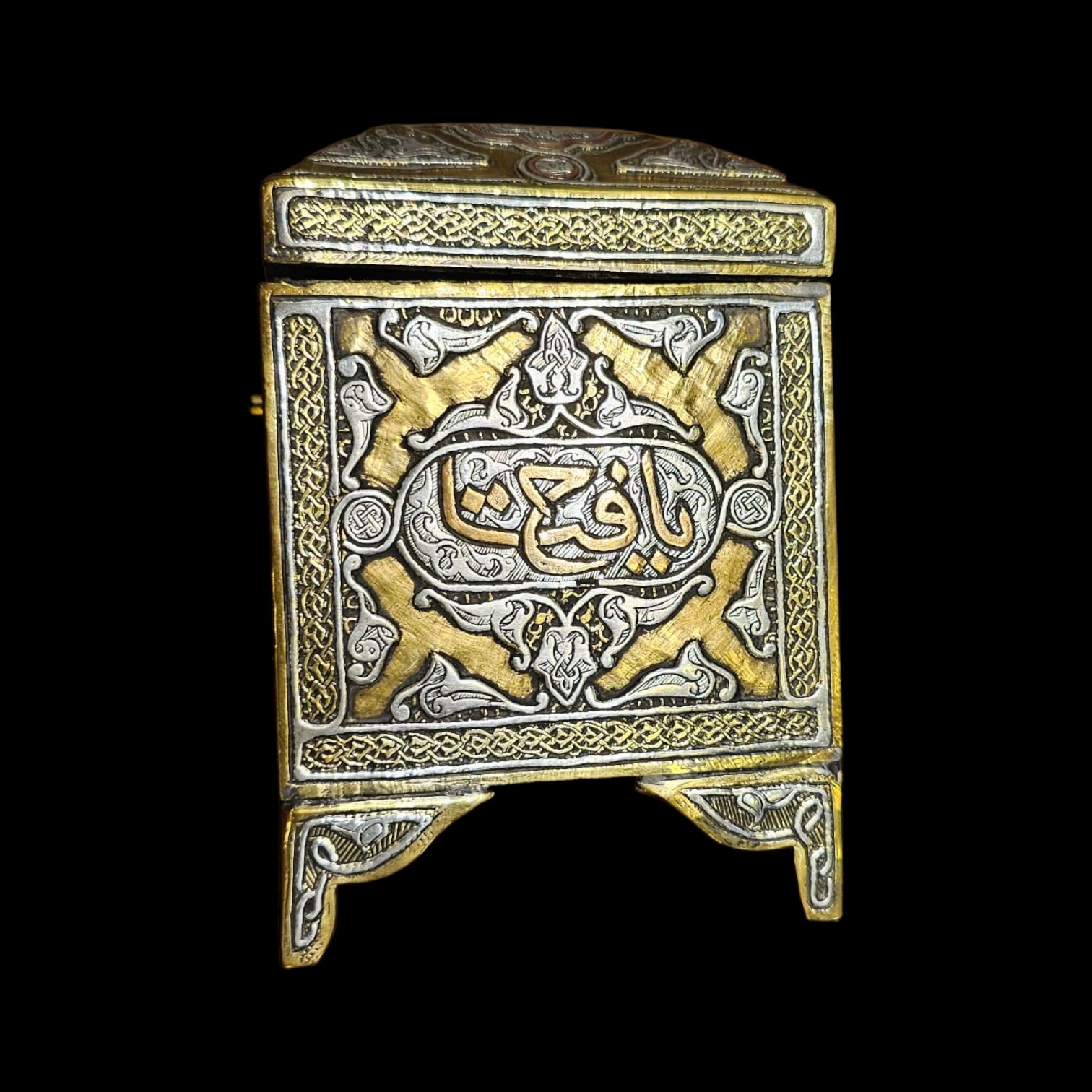 Amazing Syrian Damascene Brass Box Inlay with Gold, Silver and Copper, 19th Century